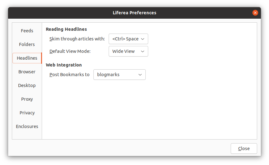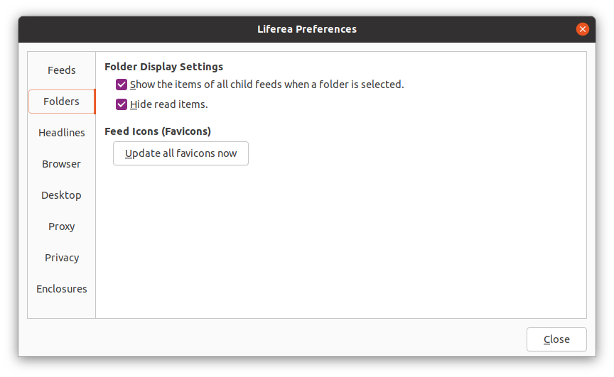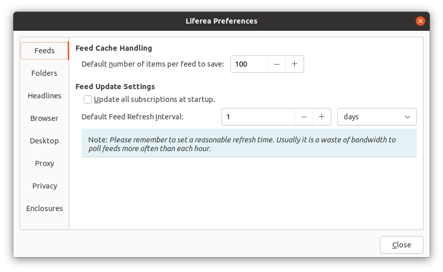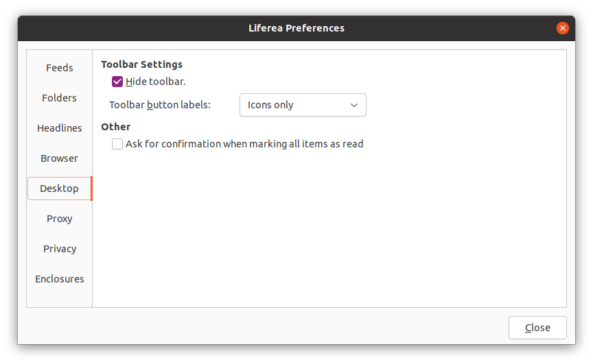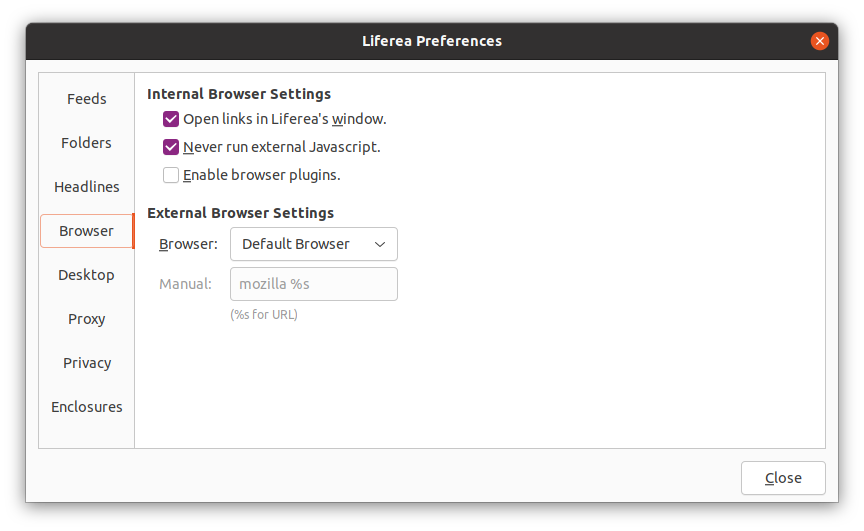 - Impostazioni del Browser Interno: Qui puoi configurare tre cose. Primo, puoi specificare se Liferea dovrebbe aprire i collegamenti cliccati nel browser esterno configurato oppure nel browser interno. La seconda opzione ti permette di disattivare JavaScript. La terza opzione ti permette di abilitare i plugin del browser.