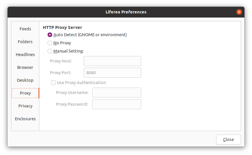 Se Liferea individua il proxy erroneamente o se se vuoi configurare un proxy differente allora dovresti usare le opzioni "Nessun Proxy" o "Impostazione Manuale".
