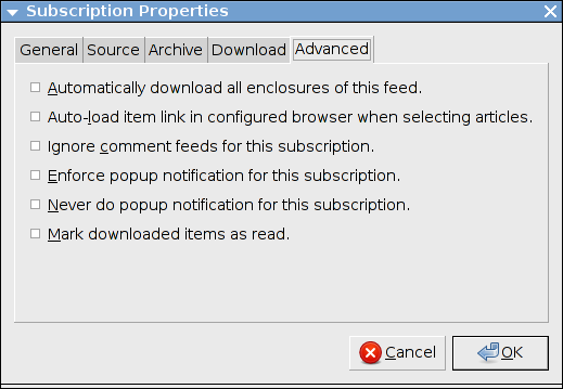 Questo pannello fornisce certe opzioni speciali per controllare come Liferea gestisce l'abbonamento. Queste opzioni sono: