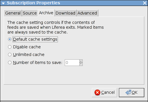 Il terzo pannello, "Archivio", controlla quanti oggetti di un notiziario sono mantenuti quando Liferea lo salva su disco. In modo simile all'intervallo di aggiornamento v'è una preferenza globale corrispondente che imposta la dimensione della memoria per tutti i notiziari. Dovresti utilizzare questo pannello solo per implementare eccezioni alla politica di memorizzazione globale.
