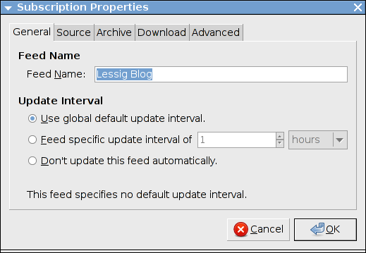 Talvolta un notiziario fornisce un proprio intervallo di aggiornamento. Se questo è il caso Liferea attiva automaticamente l'impostazione per specificare un intervallo di aggiornamento personalizzato e la popola con questo valore. Questo viene fatto solo durante la creazione iniziale dell'abbonamento al notiziario. Non dovresti mai aver bisogno di cambiare questa impostazione.