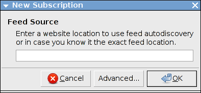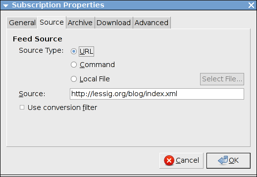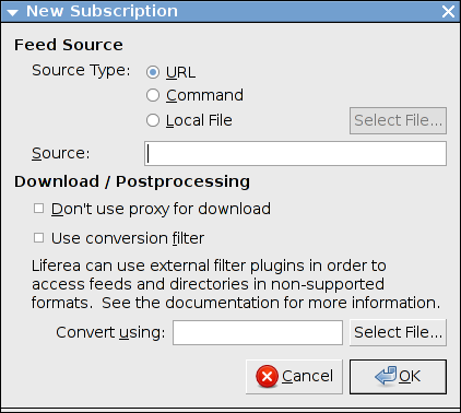Liferea supporta l'ottenimento di notiziari da fonti differenti inclusi URLs di Internet, l'output di un comando locale, e la lettura diretta da un file. Spesso, si desidera abbonarsi a un notiziario usando un URL come descritto nel paragrafo precedente. Per l'abbonamento speciale devi selezionare "Avanzato…" per aprire la seguente finestra per gli abbonamenti complessi: